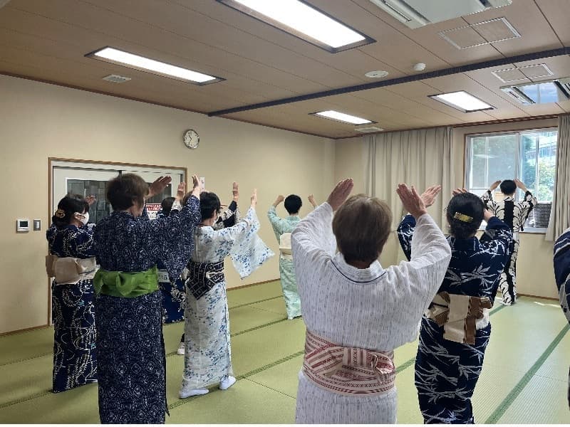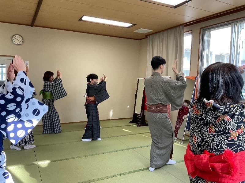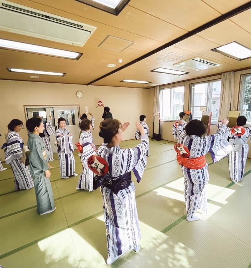 - ✴︎練習内容:始めに日本舞踊の身体や手の使い方に加えて足の運びの基礎練習を行います。調布の民謡曲「調布小唄」「調布音頭」の2曲含め、その他の盆踊り曲も練習を行います。